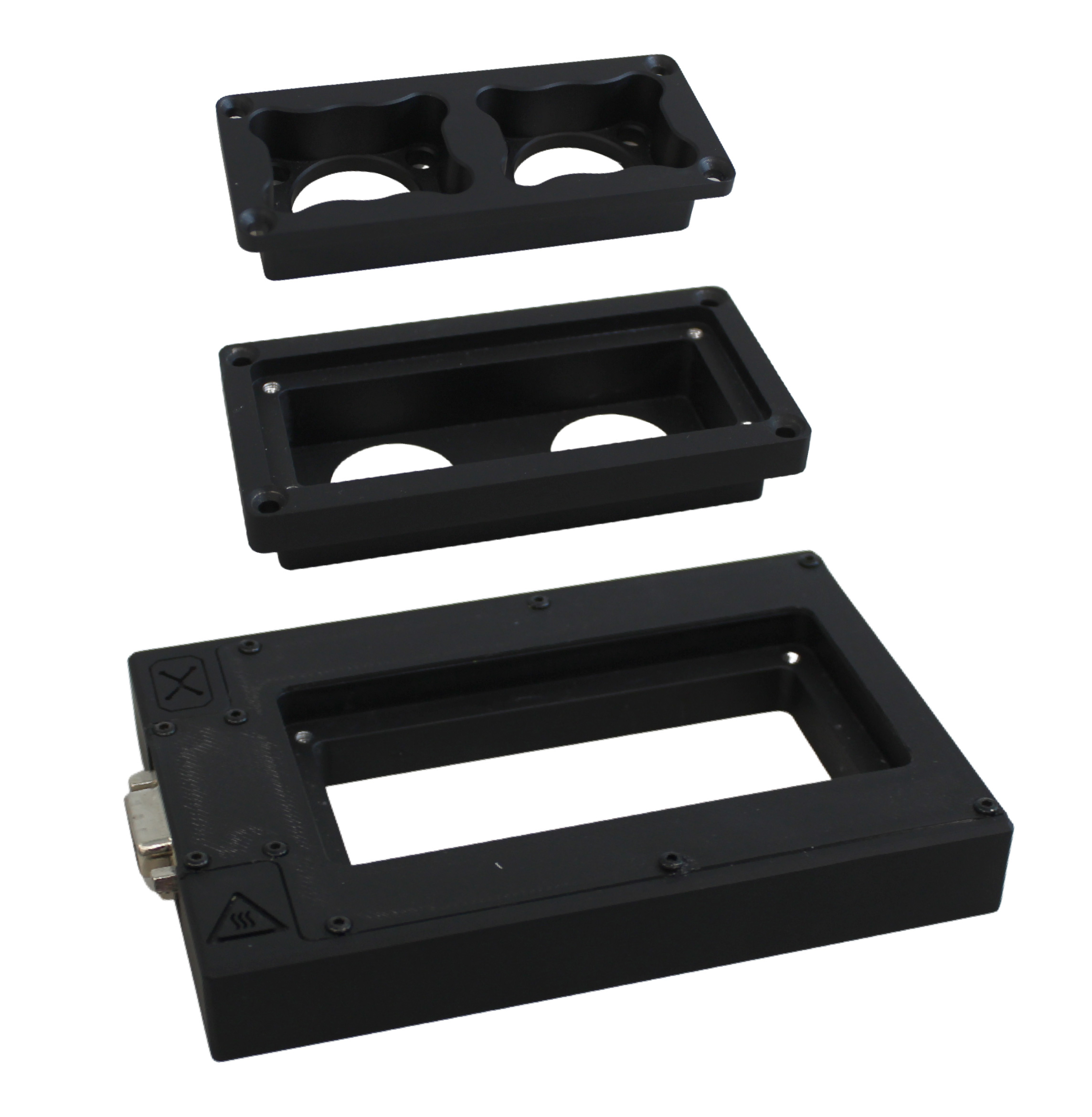 The chamber is fully mobile and compatible with standard microscope stages, enabling high-resolution imaging and screening. A microfluidic chip is clamped between two inlay parts. The inlays are fully customizable, allowing precise adaptation to a wide range of chip types—from commercially available formats to proprietary designs.